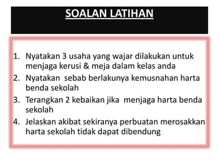 2 Menyimpan kembali barang yang digunakan ke tempat asal. Menjaga harta benda awam adalah tanggungjawab Preview this quiz on Quizizz. HARTA BENDA SEKOLAH 301 Usaha menjaga harta sekolah adalah tanggungjawab bersama.